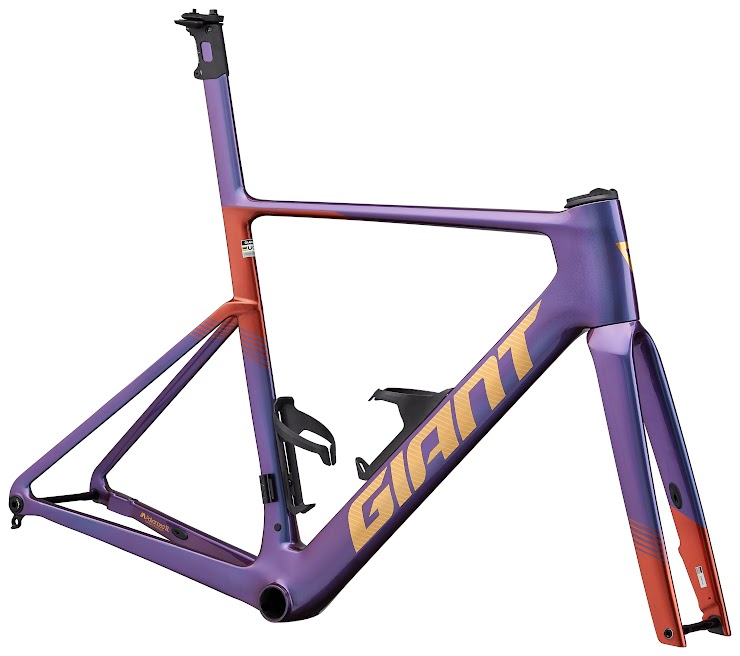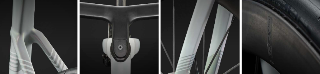• フレーム形状の最適化:主要チューブにトランケイテッド・エリプス(後部を切り落とした楕円)形状を採用し、ヘッドチューブをさらにスリム化 さらに、前三角を1つのブラダーで成型する新製法により、エアロ形状を保ちながら極限の軽量化を果たしています